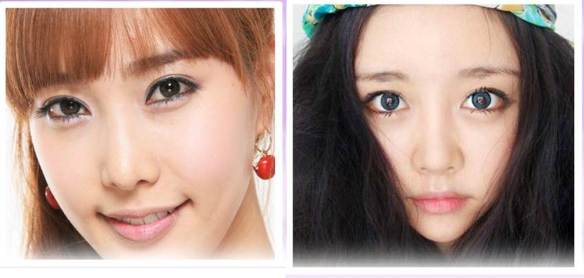 well i have no experience in this but well tomorrow will be my first time trying out cosmetics lenses 🙂 excited though but slightly worried cuz i wonder how would the feeling differ between a normal contacts and cosmetic lenses. HMM, well but i think some girls really look pretty when they wear it 😀 and i’m amazed how different people look when they put on cosmetic lenses. look at the difference below: